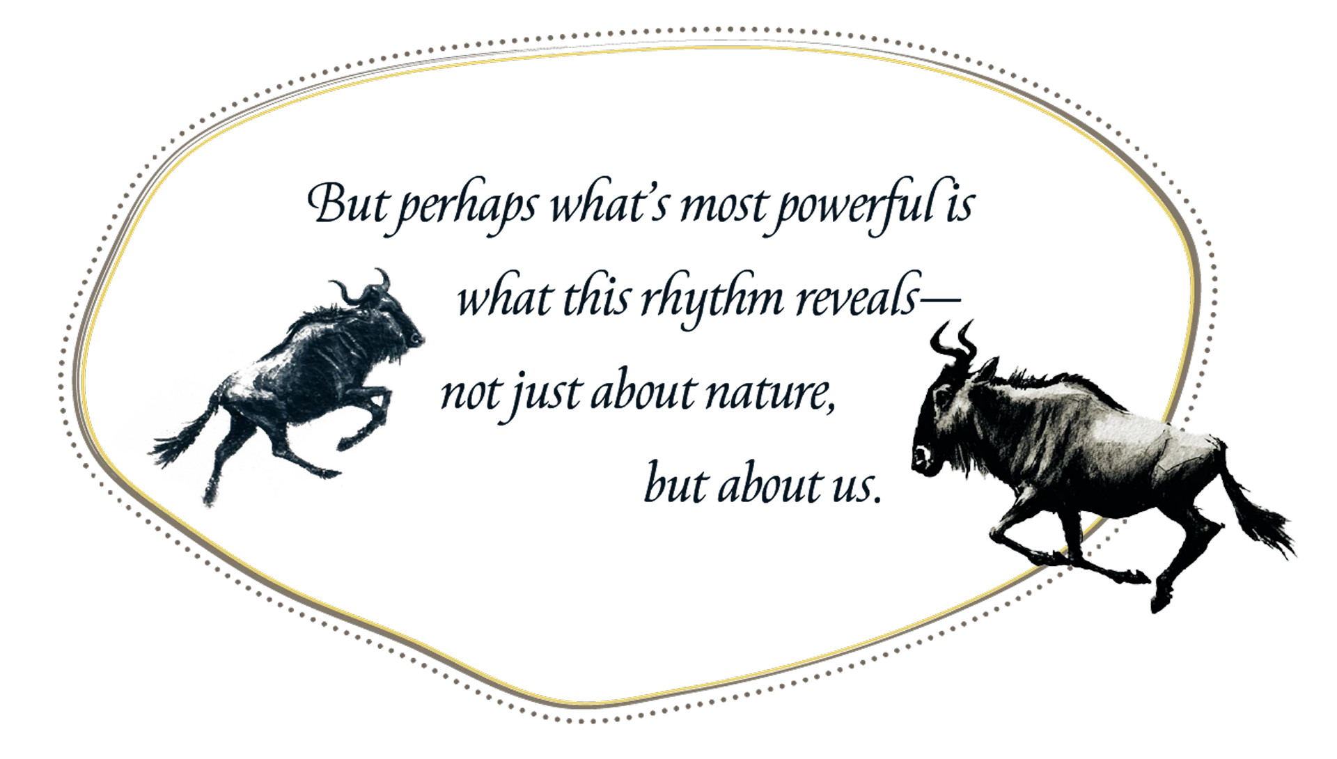 The Great Migration is about alignment. With the earth, with the sky, with the invisible maps written into instinct. And maybe it holds a quiet lesson for us too: that we are not so separate. That somewhere deep within, we also carry a memory of rhythm. A need to move, to adapt, to return. To keep finding our way through a changing world—one season, one step at a time.